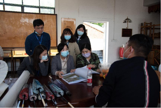 考察调研座谈会在早禾村村委召开。考察队与龙光桥街道纪委书记曾静辉、早禾村村支书曹新年、副支书樊虎、省级非遗项目明油纸伞制作技艺代表性传承人曹正新就早禾村的建设发展进行了深入交流。村领导介绍了早禾村的相关情况,并希望太阳集团tcy8722网站能为早禾村非遗传承保护、乡村振兴提供人才支撑与专业技术支撑。早禾村是湖南省美丽屋场建设试点村,该村历史文化悠久,拥有丰富的非物质文化遗产资源,该村拥有省级非遗项目非遗明油纸伞制作技艺,并因羊舞岭古窑址获评全国第七批重点文物保护单位。不过,目前早禾村古窑址大部分处于未开发状态,明油纸伞制作技艺的传承创新及营销推广也亟需注入新的力量。考察队针对早禾村面临的这些问题,围绕“非遗+乡村振兴”的主题,提出开发文创亲子游、开设手工体验作坊、设立研学基地、举办创新设计竞赛、搭建电商平台、共建实习实训基地等建设性意见。