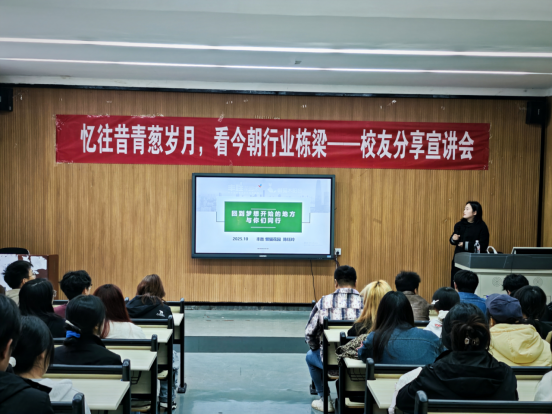 周晶校友则从行业发展现状出发,系统介绍了企业架构、岗位需求、员工晋升通道及福利待遇等内容,并分享了从求知问道到职场奋斗的成长感悟。她以亲身经历诠释了"坚持与适应并重"的职业发展理念,为学子们的职业生涯规划提供了切实可行的建议。