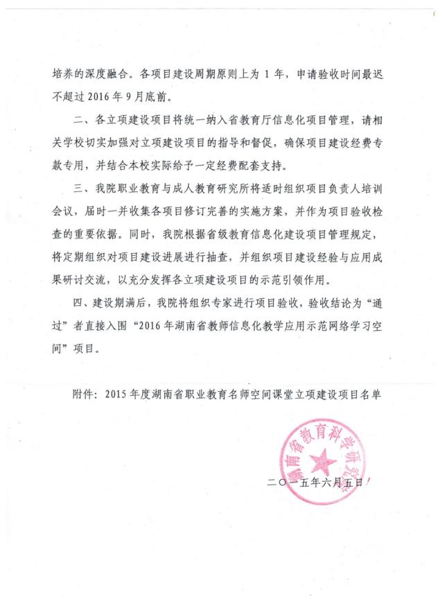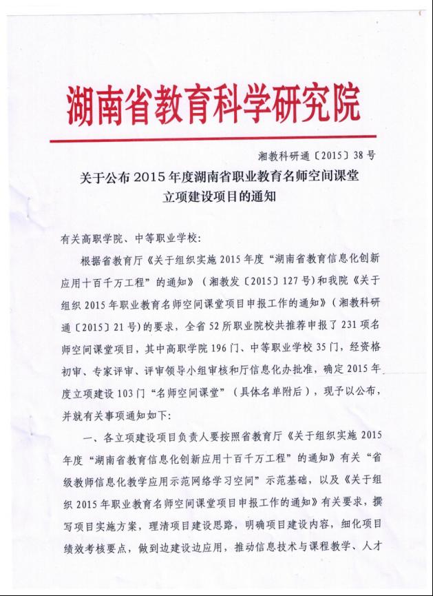 近日,湖南省教科院发布《关于公布2015年度湖南省职业教育名师空间课堂立项建设项目的通知》,我系李立蛟《Auto CAD》成功立项,现将文件公布如下:
