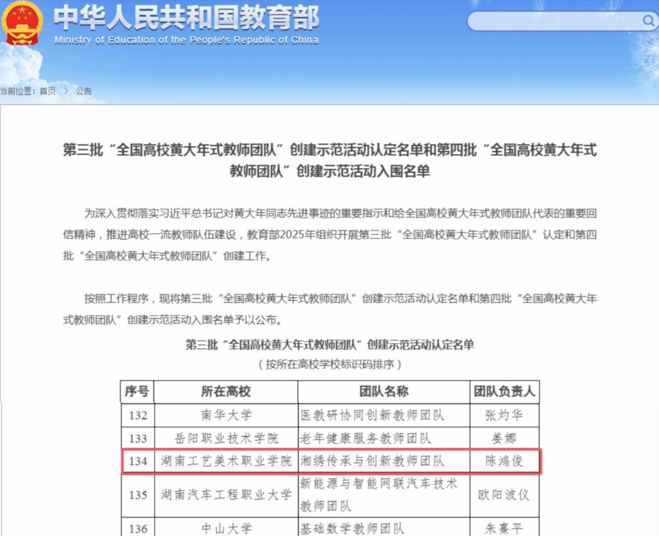 湖南教育新闻网讯(通讯员 罗雨涵 何帅文)9月5日,教育部公布了第三批“全国高校黄大年式教师团队”创建示范活动认定名单,太阳集团tcy8722网站“湘绣传承与创新教师团队”成功获得认定,这标志着该校在教师队伍建设方面取得了重要突破。