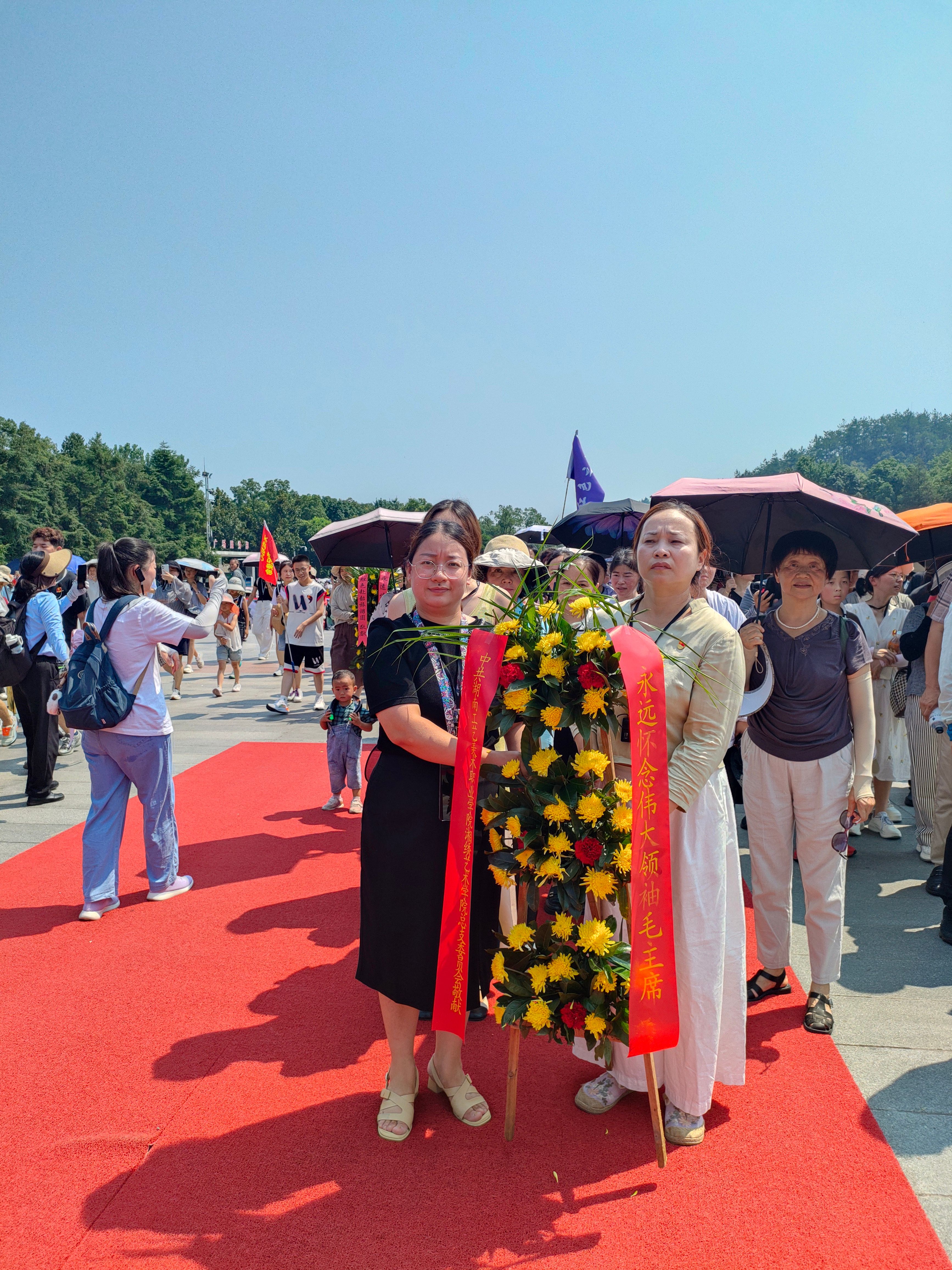 在庄严肃穆的毛泽东同志铜像广场,党员同志们整齐列队,怀着崇敬之心敬献花篮、鞠躬致敬,深切缅怀毛泽东同志为中国革命和建设事业建立的不朽功勋。